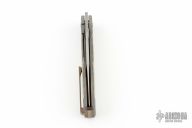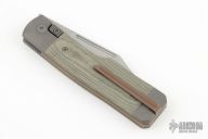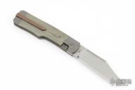 This Gunslinger Jack is a gunstock front flipper model by Jack Wolf Knives featuring a stonewash finished clip point blade with fuller. The handle has integral bead blast finish pinched and fluted titanium front and rear bolsters and liners, green linen micarta inlays, anodize finish backspacer, and titanium tip up clip. Has filler tab for clip. Comes with box, metallic tube with J. Gonzo artwork, sticker, pog, and microfiber cleaning cloth. New condition.