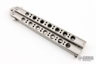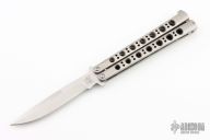 This Model 42 Balisong by Benchmade features a tumble finished blade with swedge. The handle has an integral skeletonized titanium handles with T-latch on pommel. Comes with original box, nylon sheath and papers. Excellent condition.