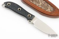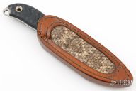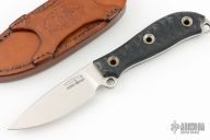 This Boney Active Duty (BAD) by the Busse Custom Shop features a satin finished drop point blade, .133" blade stock, 1.069" blade depth. Full tang construction with black G-10 scales and a lanyard hole. Comes with a brown leather sheath with Rattlesnake skin inlay by Armoral Leather.Excellent condition.