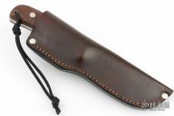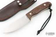 This Deer Creek Skinner by Scott Gossman features a satin finished blade with a full tang construction, .188" Blade Stock and 1.478" Blade Depth. The handle has brown burlap micarta scales. Includes a brown leather sheath with belt loop. Excellent condition.