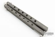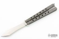 This Model 67 Balisong by Benchmade features a tumble finished tanto recurve blade and Flytanium tumbled titanium handles with T-latch. Comes with a zipper case and original papers. Has a couple light scuffs, otherwise excellent condition.