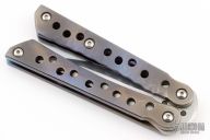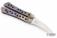 This Balisong by Steve Ryan features a satin finished upswept hawkbill style blade with false top edge. The handle has orange peel and heat colored titanium handles with sculpted pattern. Comes with nylon zippered case. Has a few light scuffs, otherwise excellent condition.