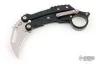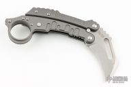This QTR-9 K.I.T.T. by Quartermaster Knives features a tumble finished kerambit style blade with swedge, thumb hole and notched thumb rest. The handle is comprised of machined black G10 scales over a titanium liner on the "A" side and a bead blasted titanium "B" side. 0.977" finger hole in pommel with a tip up titanium pocket clip. Includes a spring loaded lock latch to hold the knife in both the open and closed position. Marked 178/300 on blade. Includes a padded zippered case. Excellent Condition.