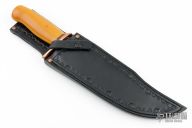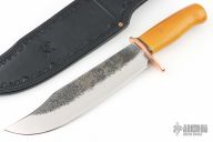 This Bowie by James Behring features a clip point blade with hammer marked flats and satin finished grinds, .248" blade stock and 2.233" blade depth, hidden tang construction. The handle has a copper guard, antique linen micarta grip with black and copper spacers. Comes with a hand tooled black leather sheath. Excellent condition.