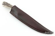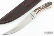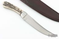 This Knife by Tommy Lee features a hand rubbed satin finish blade with false top edge, .166" blade stock, 1.120" blade depth, full tapered tang construction. The handle has satin finished dovetailed stainless steel bolsters and stag scales with black liners.  Comes with a brown leather sheath and a zippered case. Excellent condition.