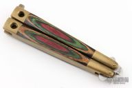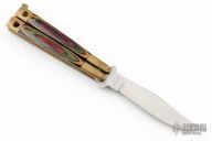 This balisong by Frost Cutlery features a satin finished clip point blade. It has brass channel construction handles with diamond wood inlays. Has a brass T-latch. Comes with a zippered case.  Has some scratches, otherwise excellent condition.