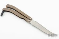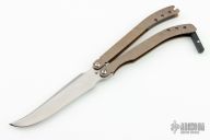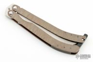 This balisong by Reese Weiland has a satin finished blade with false top edge. The handles are textured and anodized titanium with a G10 latch at the butt, black G10 spacers. Comes with a zippered case. Excellent Condition.