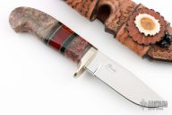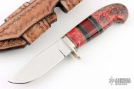 This Hunter by D'Alton Holder features a mirror polished blade with .159" blade thickness and 1.062" blade depth, hidden tang construction. The handle has a nickel silver guard, box elder burlwood grip with black/nickel silver/red amber spacers. Beautiful combination of materials and excellent workmanship. Comes with a hand tooled brown leather sheath. Excellent condition.