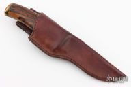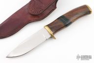 This Knife by D'Alton Holder features a mirror polished blade with .191" blade thickness and 1.167" blade depth, hidden tang construction. The handle has a brass guard and butt, desert ironwood grip with with black and brass spacers. Comes with a brown leather sheath. Has a few light scratches, otherwise excellent condition.  Made in Texas.