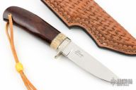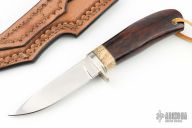 This Knife by D'Alton Holder features a mirror polished blade with .166" blade thickness and .963" blade depth, hidden tang construction. The handle has a nickel silver guard, desert ironwood burl grip with with black/nickel silver/oosic spacers. Comes with a hand tooled brown leather sheath. Has a few light scratches, otherwise excellent condition.