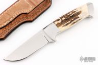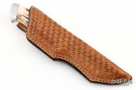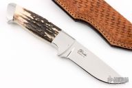 This knife by D'Alton Holder features a mirror polished blade with .166" blade stock and 1.113" blade depth, full tapered tang construction. The handle has stainless steel bolsters, stag scales. Comes with a hand tooled brown leather sheath and a zippered case. Has some light scratches and a couple oxidation spots on the bolsters, otherwise good condition.