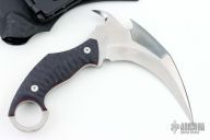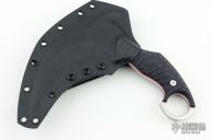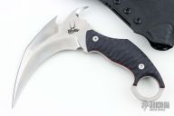 This Karambit by Shade Indonesia features a satin finished hawkbill blade, .264" blade stock and 1.992" blade depth, full tang construction. The handle has black G-10 scales over red liners with a ring at the butt. Comes with kydex sheath with belt clip. Excellent condition.
