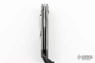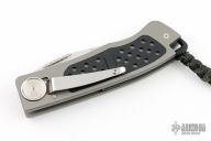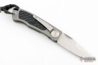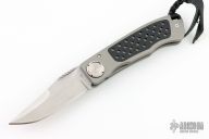 This folder by Columbia River Knife and Tool is a Ron Lake design that features an aluminum handle with black inlays. Tip down carry. Firm lock up, nice detent and seating. False top edge on blade. Excellent condition.