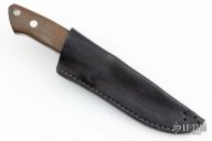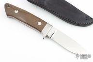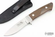 This Loveless Hunter has a mirror polished N690 Stainless Steel drop point blade with full/ tapered tang. Blade width 3/16", depth 1-1/16". Handle is green micarta with polished aluminum pins and red liners. Bolster is N690 mirror polished Stainless Steel with stippling soldered inlays. Includes a black leather sheath.  Excellent Condition.