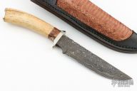 This Knife by Herb Derr features a Bird's Eye Pattern Damascus blade with file worked spine, .179" blade depth and 1.146" blade depth, hidden tang construction. The handle has a nickel silver guard and pommel with wood and nickel silver spacer and a sea cow rib bone grip. Includes a brown leather sheath with lizzard skin inlay. Excellent Condition.