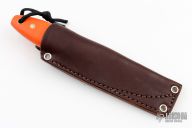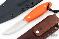 This Kamrat by LT Wright features a satin finished scandi ground blade with .095" blade stock and .830" blade depth, full tang construction. The handle has orange G-10 scales. Comes with original box and brown leather sheath. Excellent condition.