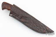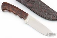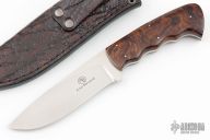 This knife by Arno Bernard features a satin finished drop point blade, .180" blade stock and 1.342" blade depth, full tapered tang construction. The handle has desert ironwood scales. Comes with a brown leather sheath. Excellent Condition.