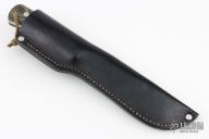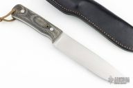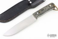 This 7" Big Boar Tusker by Scott Gossman features a satin finished drop point blade with a full tang construction, .214" Blade Stock and 1.518" Blade Depth. The handle is composed of burlap micarta scales. Includes leather sheath with belt loop. Excellent condition. 1V Blade Steel