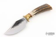 This skinner has a satin finish blade with hammermarked flats and a brass guard. Stag handle. .156" Blade Stock. 1.156" Blade Depth. Very nice work. Includes a brown leather sheath. Excellent Condition.