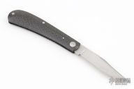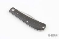 This Shadow Trapper by Jim Dunlap features a hand rub satin finished clip point blade with nail nick. The handle has lightening strike carbon fiber covers and a stainless steel spring. Has a half-stop, flush in all positions. Has been resharpened.  Has light scuffs/scratches otherwise the knofe is in good condition.  Would make a good user.