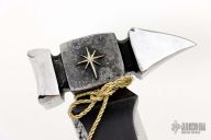 This One Handed Fantasy Warhammer by Enzo Iron is forged traditionally from 1080 high carbon steel. It has a 2.5lb head and is 20.5" overall. Has a flamed hickory handle with. Brass star element on both sides. Fashioned after warhammers seen all across the fantasy spectrum, very squat pattern makes swinging it feel super efficient.  Spike being very stout doesn’t have the same puncture quality as historical warhammers but will add a vast conductive force behind a very small spike make it pretty formidable!  New from maker.