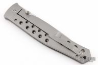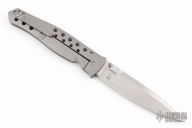 This Mega Dr. Death by Tom Mayo features a hand rubbed satin finish blade with false top edge and dual thumbstuds with mosaic pin inlays. The handle has a bead blasted titanium frame with titanium tip up clip, titanium standoffs. Nice detent, lockup and blade seating. Excellent condition. Comes with a velcro case. Has the "RWM Team" Logo.