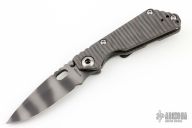 This JVA by Mick Strider is larger than a PT, but smaller than an SNG. It features a tiger striped blade with notched thumbrest and thumbhole. The handle has a flame finished titanium frame with matching tip up clip. New condition.