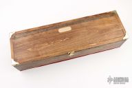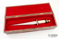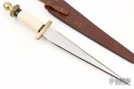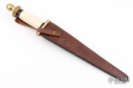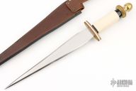 This Arkansas Toothpick features a mirror polished blade with .180" blade stock and 1.574" blade depth, hidden takedown tang construction. The handle has a brass and ivory paper micarta guard and butt, composite ivory grip with buffalo horn and black linen micarta spacers. Comes with a brown leather sheath and a wooden presentation box with the initials "JMB" on it. Has a small crack in the handle near the guard, some patina, otherwise excellent condition.