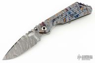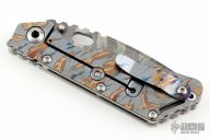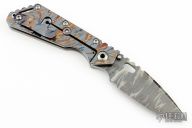 This Mick Strider Performance Series SMF framelock folder features a tiger stripe camo blade with thumbhole and notched thumbrest. The handle has a tiger stripe camo titanium frame with titanium clip, tip up carry. Jimping on blade spine. Includes Hinderer "Lock Bar Stabilizer" for maximum reverse lock retention. Nice detent, lockup and blade seating. New condition. Comes with a Strider velcro case.