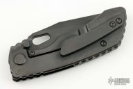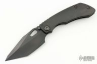 This Evolution 4.0 by Custom Knife Factory features a DLC finished tanto blade with notched thumbrest and thumbhole. The handle has a DLC bark finished titanium frame with a backspacer with a matching tip up pocket clip. Comes with velcro case, extra hardware, and COA. Nice detent, lockup and blade seating.  #49 and dated 1/24.  Excellent condition.
