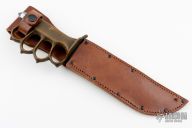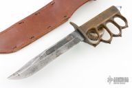 This is a trench knife has been given a Camillus MK2 fighting knife blade. It has a cast Brass handle with U.S. 1918 stamped on one side. The blade is clip point with a sharpened top edge and fullers, .170" blade stock and 1.170" blade depth, hidden tang construction. Comes with a brown leather sheath. Has some patina and scratches, has been resharpened, otherwise good condition for its age.