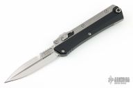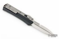 This Glykon by Microtech features a stonewashed double edged blade with fullers and notched thumbrest. The handle has a black aluminum chassis with bead blasted titanium overlays and tip down clip. Comes with original box and papers. Excellent condition. Dated 07/2023 and #2454