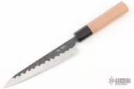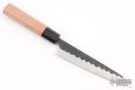 The Koishi line features a stainless steel kurouchi finish. The kurouchi finish at the top of the knife helps keep these knives relatively low maintenance when compared with other Japanese carbon knives. The edge of the blade, however, will form a patina as it is made from Aogami Super Steel. Hardened up to 63:65 Rockwell, edge retention of these blades is outstanding.