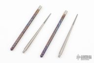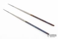 Feed yourself and your pride of ownership with these exquisitely crafted titanium chopsticks. Designed and engineered by world-renowned custom knifemaker Alan Folts and manufactured under the Foltsum™ brand, these chopsticks are beautifully crafted from solid 6AL 4V titanium stock. Their two-piece construction allows them to be conveniently carried when not in use, yet assembled in seconds thanks to a precision threaded joint. Machined in painstaking detail, they feature three different surface finishes, including a bead blasted area near the tip for a secure grip on food, a satin-finished center section, and a rich color-anodized handle section. Machined accents at the top and center add both a touch of style and a thoughtful grip texture that complements their perfect balance.Remarkably strong and lightweight, these elite eating utensils are also 100% corrosion resistant, completely food safe, hypoallergenic, and easily cleaned with ordinary soap and water. They come complete with a ballistic nylon carry pouch with dedicated pockets for all four pieces and a heavy-duty Velcro® closure.