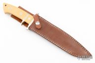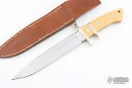 This Sub Hilt Fighter from Steve Voorhis features a mirror polished clip point blade with sharpened top edge, .241" blade stock and 1.362" blade depth, full tapered tang construction. The handle is comprised of a nickel silver guard and sub hilt, yellow paper micarta scales over red liners. Comes with brown leather sheath. Has a couple light scratches and one oxidation spot on the blade, good condition otherwise.