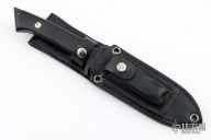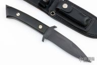 This RWJ Combat knife features a black blade with a sharpened top edge, .192" blade stock and 1.121" blade depth, full tang construction. The handle has black linen micarta scales. Comes with a black leather sheath. Has a few scuffs, otherwise excellent condition.