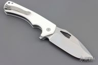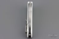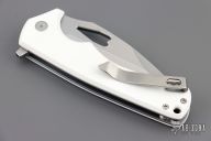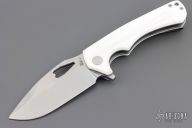 This Defiant by Blunt Force Blades features a stonewashed blade with a thumb hole and a notched flipper tab.  The handle has white G-10 scales over steel liners and a tip down titanium pocket clip.  Includes the original box.  Excellent Condition.