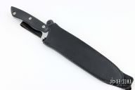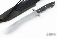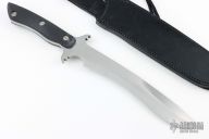 This Mamba 9-L by Blackjack Knives features a satin polished recurve blade with a sharpened top edge, .253" blade stock and 1.459" blade depth, full tang construction. The handle has rubber scales. Comes with original black leather sheath. There is no markings on this knife, but I think it may have been repolished at some point, otherwise excellent condition.