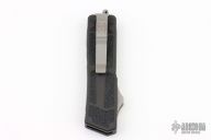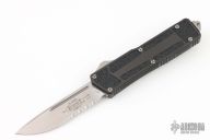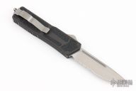 This Scarab OTF auto by Microtech has a stonewashed partially serrated blade with fullers. The handle is black aluminum with blasted fittings, single glass breaker, tip down stainless steel clip. #0894 and dated 04/2003. Includes original sheath with file and tool, plastic tube, and paperwork. Excellent Condition.