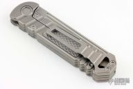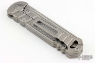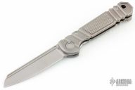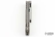 This knife features a bead blasted sheepsfoot style blade with fullers and a notched blade spine. The handle has a bead blasted titanium frame with a matching tip pocket clip. Includes a padded zippered case. Excellent Condition.