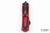 This Scarab OTF automatic by Microtech features a black double edge blade with a plain edges and red aluminum handle with non-slip inserts. Black coated stainless steel clip. Glass breaker. 02/2007 and serial number 01453. Comes with original box, sheath and papers. Has some minor wear on the edges of the clip, has a couple light rub marks on the blade, otherwise excellent condition.