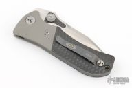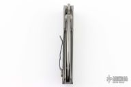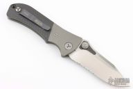 This MTX2 by Microtech features a satin finished partially serrated clip point blade with swedge, carbon fiber inset, dual thumb studs and notched thumbramp. The handle is comprised of blasted titanium bolsters and carbon fiber scales over blasted titanium liners and black polymer backspacer. The titanium tip up clip is positioned for right hand carry. Dated 06/2004 with a S/N of 0831. Comes with original box, sheath and papers. Has a couple very light scuffs, otherwise excellent condition.
