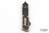This QD Scarab OTF Auto by Microtech features a single edged satin and black blade and tan aluminum handle with nonslip inlays, black thumb slide. Has cut outs in the blade to make it easier to deploy underwater. Includes original box and papers. Dated 10/2015 and #14990. Excellent condition.