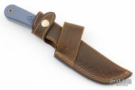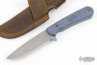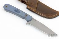 This drop point hunter by American Blade Works features a bead blasted blade with a full tang construction. .141" Blade Stock. .958" Blade Depth. The handle has blue G-10 scales. Includes a brown leather sheath. Excellent Condition.