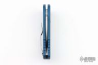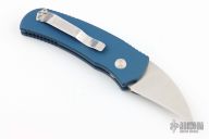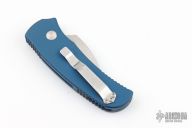 This Stingray side-opening automatic by DKD has a satin finished hawkbill blade and blue aluminum handle. California legal. Coil spring. Has a tip up clip. Has some scuffs, otherwise excellent condition.