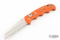 This Spyderco Autonomy features a satin finished fully serrated blade, H-1 Blade steel. The handle has orange G-10 scales, stainless steel liners, and a tip up reversible clip. Has some light scuffs, excellent condition otherwise. Not a factory second.