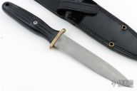 This Applegate Fairbairn Fighting Knife was made by TJ Yancey. It has a bead blast finished 154 CM stainless steel spear point DE blade (circa 1980) with hidden tang. 3/16" blade stock, 1-1/8" depth. Handle is black non-slip polymer with lanyard hole, and brass double guard (stamped "121"). For a 40+ year-old piece, this knife is in good shape. Comes with custom black leather sheath by Tex Shoemaker and Sons. Only 331 made with the black polymer handle. Has some light oxidation and scuffs, otherwise good condition.