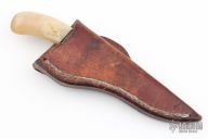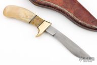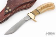 This Fawn by Butch Deveraux features a drop point blade with visible temper line, .171" blade stock and .717" blade depth, hidden tang construction. The handle has a brass guard with sheep horn grip and black spacers. Comes with a brown leather sheath. Excellent condition. Dated '10. Butch studied under Ed Fowler and is a graduate of the High Performance Blade School.