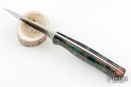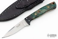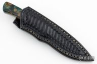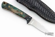 This knife by Alan C Warren features a hand rub satin finished blade with false top edge, .113" blade stock and .779" blade depth, full tapered tang construction. The handle has a black G-10 bolsters, dyed maple burl scales with red/black liners and mosaic pins, lanyard hole. Comes with hand tooled black leather sheath and a zippered case. Excellent condition. #2375