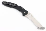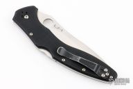 This Ulize from Spyderco features a satin finished recurve blade with thumbhole and notched thumbrest. The handle has black G-10 scales, stainless steel liners and backspacer, and a black 4-way reversible black coated stainless steel clip. Has some wear on the clip and some scratches, otherwise good condition.
